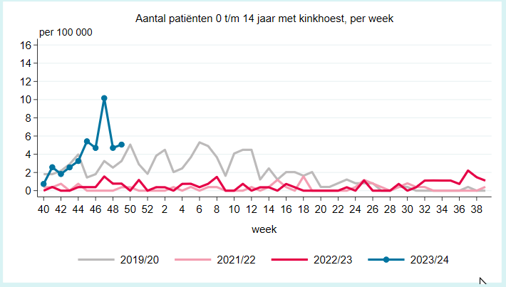 Kinkhoest vertoonde een hoge piek, maar laat nog steeds waarden zien die veel hoger liggen dan andere jaren. Voorzichtig hoor je nu ook geluiden in de media dat deze extra infecties te maken hebben met herhaalde Corona-infecties bij kinderen, die het immuunsysteem mogelijk zwakker kunnen hebben gemaakt. Dit effect van een SARS-infectie was reeds bekend uit de SARS-1 pandemie, waarbij overlevers 18 jaar na 1 enkele infectie met het SARS-1 virus nog steeds verstoringen hebben in hun immuunsysteem.