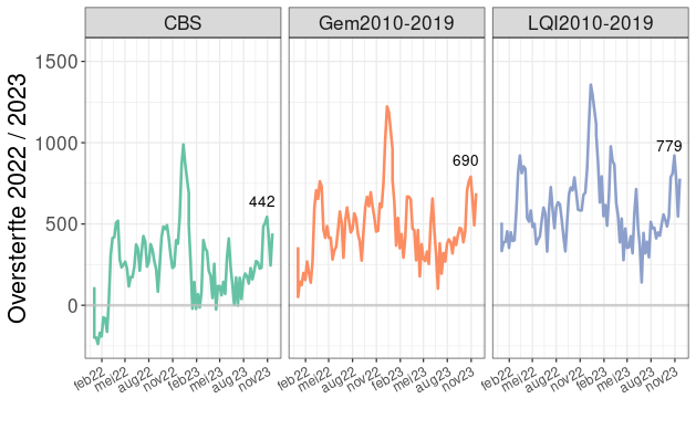 Met de methode van het CBS komt de oversterfte uit op 442 (14,4%). Wordt het gemiddelde uit de human mortality database gebruikt, dan vinden we een oversterfte van 690 (24,4%) en houden we er rekening mee dat we ook iets van deze pandemie hadden kunnen leren op het gebied van preventie van luchtweginfecties, dan wordt een oversterfte van 779 (28,4%) gevonden. Het verschil tussen de drie maten neemt waarschijnlijk toe in de winter, omdat het CBS rekening houdt met het griepseizoen, terwijl de andere maten (deels) rekening houden met dat we nu weten hoe we het aantal griepdoden kunnen verlagen (maar dit niet doen).