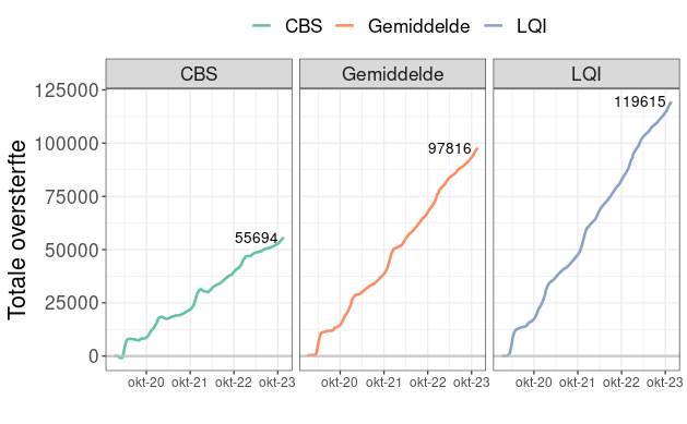 De totale aantallen zijn groot. Er zijn meer dan 55 duizend mensen extra overleden volgens de CBS methode, en rond de 100 duizend of meer volgens de andere twee methoden. Verschillende oorzaken zijn aan te wijzen, maar ze hebben allemaal met de pandemie, en onze respons erop, te maken. Mensen overlijden direct aan Covid, maar recent onderzoek laat zien dat ook in de maanden en jaren na een Corona besmetting er veel mensen extra overlijden. Die doden worden niet geregistreerd als een overlijden aan Covid, maar bijvoorbeeld een overlijden aan een hart- en vaatziekte, of een andere infectie. Op nog langere termijn verwachten we ook een toename aan het overlijden aan dementie door Covid.