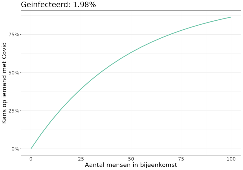 1,2% meldt een positieve test. Dat is lager dan de circa 2% die uit het aantal virusdeeltjes in het riool volgt (door aan te nemen dat iemand 10 dagen besmettelijk blijft na zijn of haar besmetting). Gaan we ervan uit dat 1 op de 50 momenteel besmettelijk is, dan heb je bij een bijeenkomst van ongeveer 30 deelnemers rond de 50% kans dat iemand daar besmettelijk met Covid is.