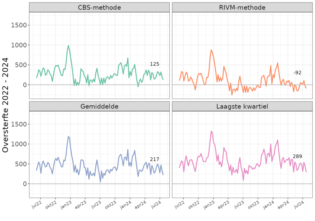 Het CBS meldt voor week 30 een sterfte van 2911. Daarnaast zijn er bijstellingen voor de sterfte van de weken ervoor. Hiermee komt de oversterfte volgens de doorgetrokken CBS-methode uit op 125. Bij de RIVM-methode, waarin de sterfte door de pandemie het nieuwe normaal is, is er weer sprake van ondersterfte (-92). Op basis van het gemiddelde tussen 2010 en 2019 en het laagste kwartiel van die jaren, komt de oversterfte op 217 en 289 respectievelijk uit.