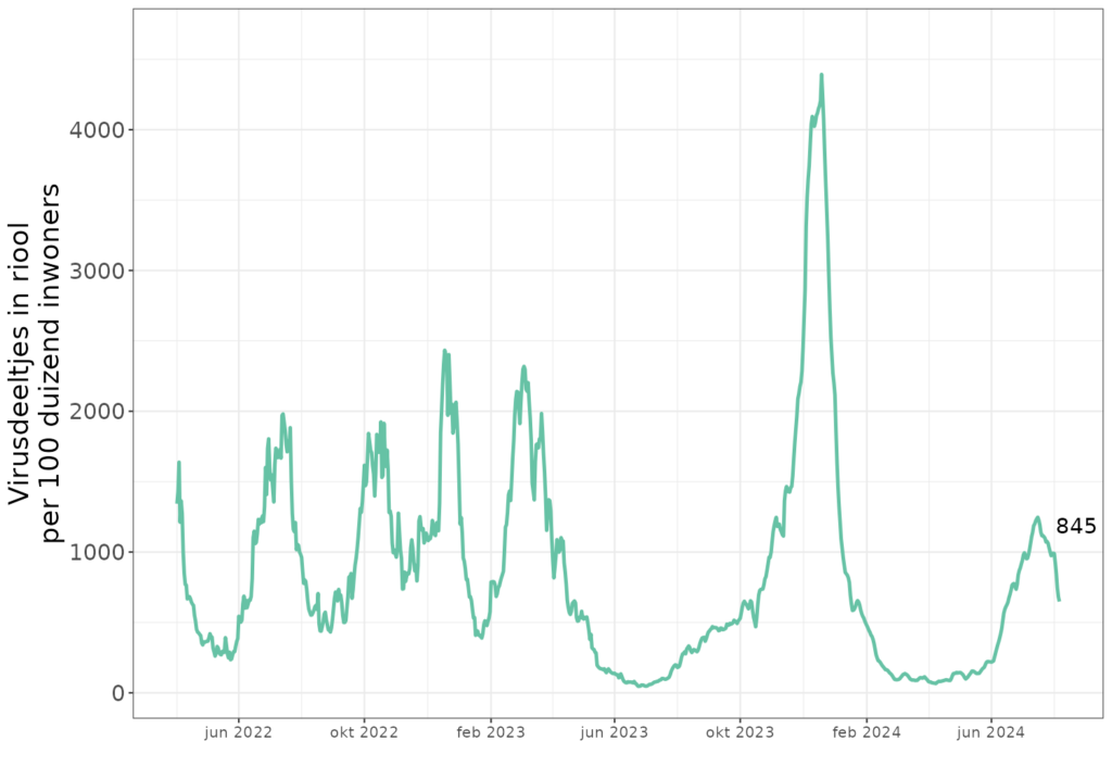 Kijken we naar de week voorafgaand aan de meest recente betrouwbare meting (3 augustus 2024) en zetten we het aantal virusdeeltjes om naar een schatting van het aantal besmettingen (met behulp van de methode van DataGraver), dan komen we uit op een totaal van ongeveer 240 duizend nieuwe besmettingen in deze week. Kijken we naar de huidige golf, die ongeveer eind mei begon, dan zitten we nu op een totaal van ongeveer 2 miljoen besmettingen in deze zomergolf (ongeveer 11% van de bevolking besmet).