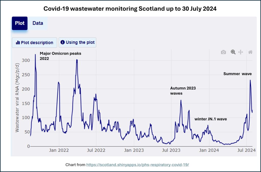 Het risico op besmetting blijft hoog. Het aantal deeltjes in het riool lijkt een daling in te hebben gezet, maar het is afwachten of deze daling doorzet als mensen terugkomen van vakantie en de scholen weer beginnen. De huidige golf (begonnen eind Mei) heeft tot dusver voor ongeveer 2 miljoen besmettingen gezorgd. Dat geeft veel gezondheidsschade. Ook economisch heeft het zin om het aantal besmettingen te beperken: Personeelstekorten blijven aanhouden en de arbeidsproductiviteit neemt niet veel meer toe. Ongeveer 1 op de 50 Nederlanders is momenteel besmettelijk. Er zijn geen gegevens over ziekenhuisopnames of -bezetting bekend. De variant KP.3 is momenteel dominant.