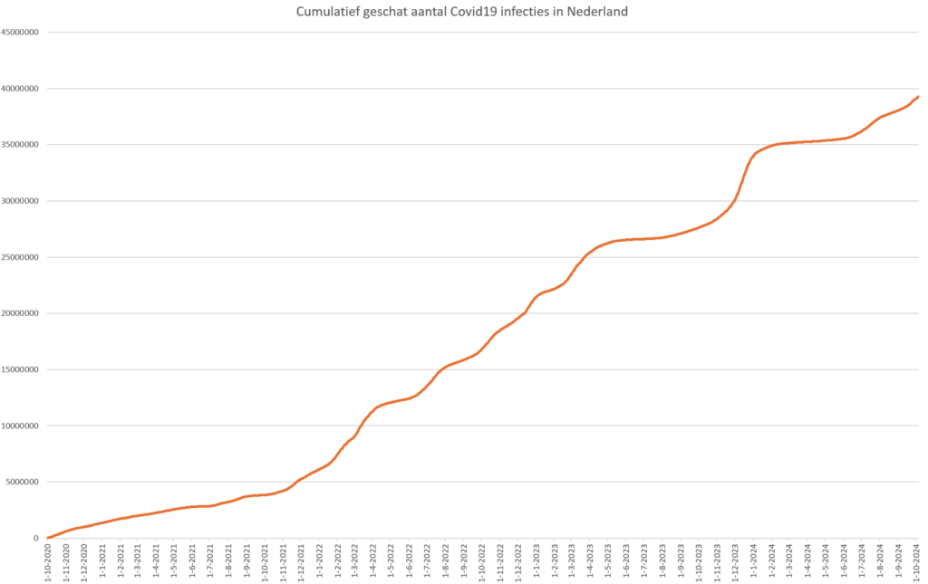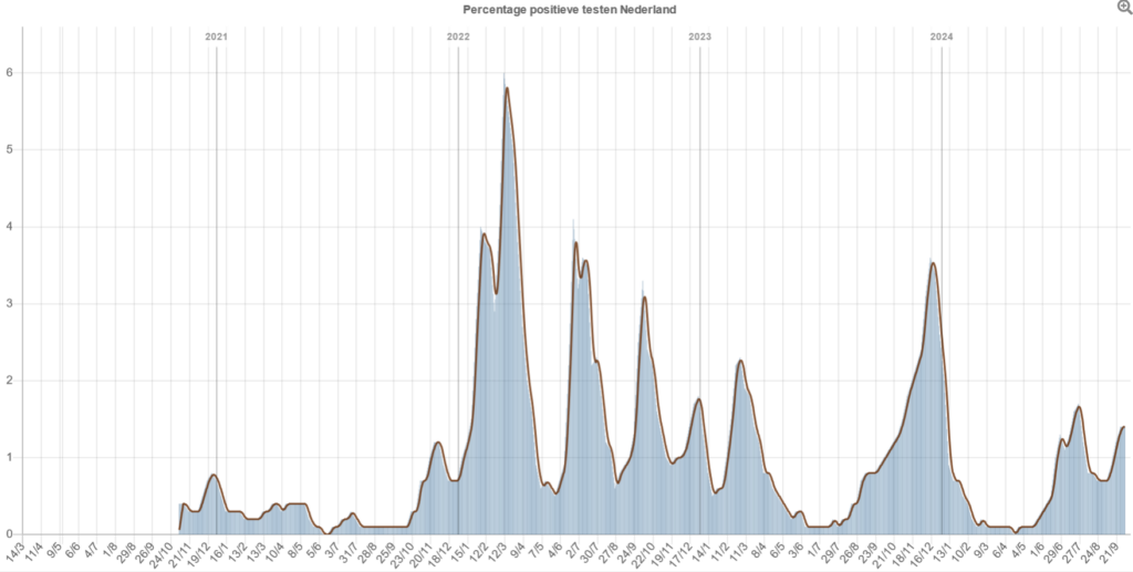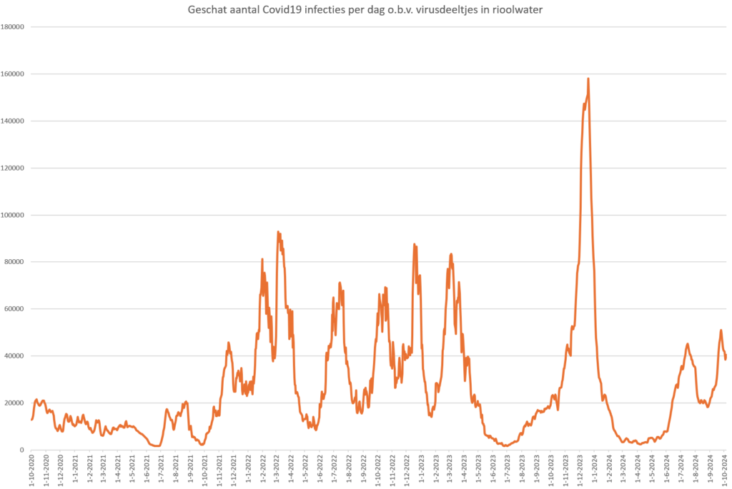 Het percentage mensen met klachten van acute luchtweginfecties, o.b.v. meldingen door een groep vrijwilligers aan het RIVM, geeft op elk moment een idee van het besmettingsrisico. Op 8 oktober had 10,74% van de testgroep van het RIVM last van een luchtweginfectie. Dus één op de tien personen worstelt op dit moment met een luchtweginfectie! Dat is al bijna net zo hoog als tijdens de bizarre winteruitbraak 2023-2024. En het blijft stijgen!