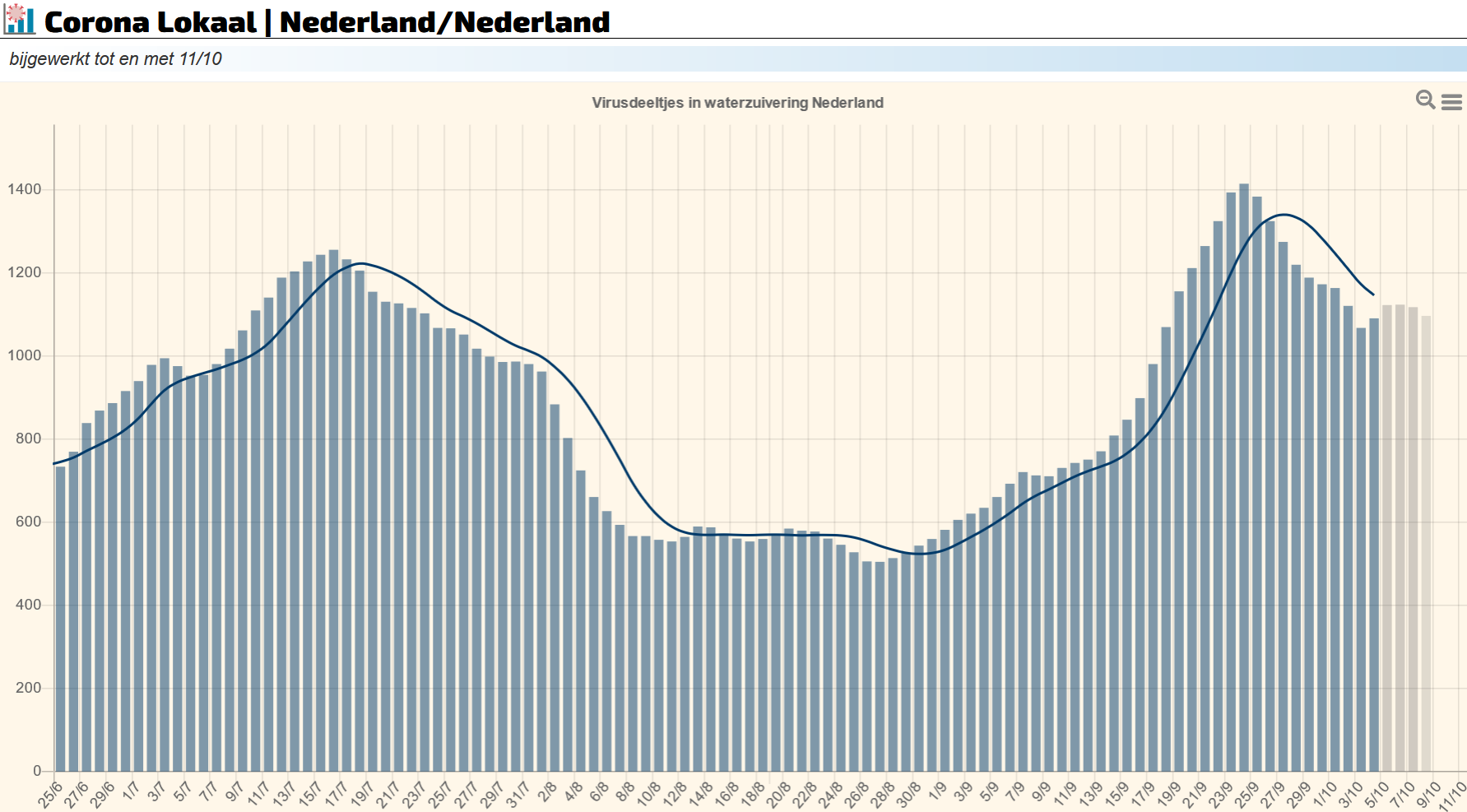 In onderstaande grafiek van Corona Lokaal is het verloop van virusdeeltjes in het rioolwater weergegeven vanaf 25 juni tot heden. De grijze balken bij de laatste dagen 5 t/m 8 oktober duiden op minder zekerheid omdat daar nog minder dan 50% van de meetstations samples gerapporteerd hebben.