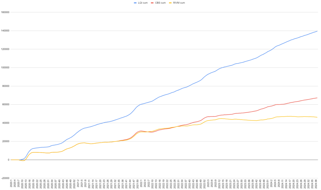 Het verloop van het cumulatieve aantal doden volgens LQI, CBS & RIVM is nu: