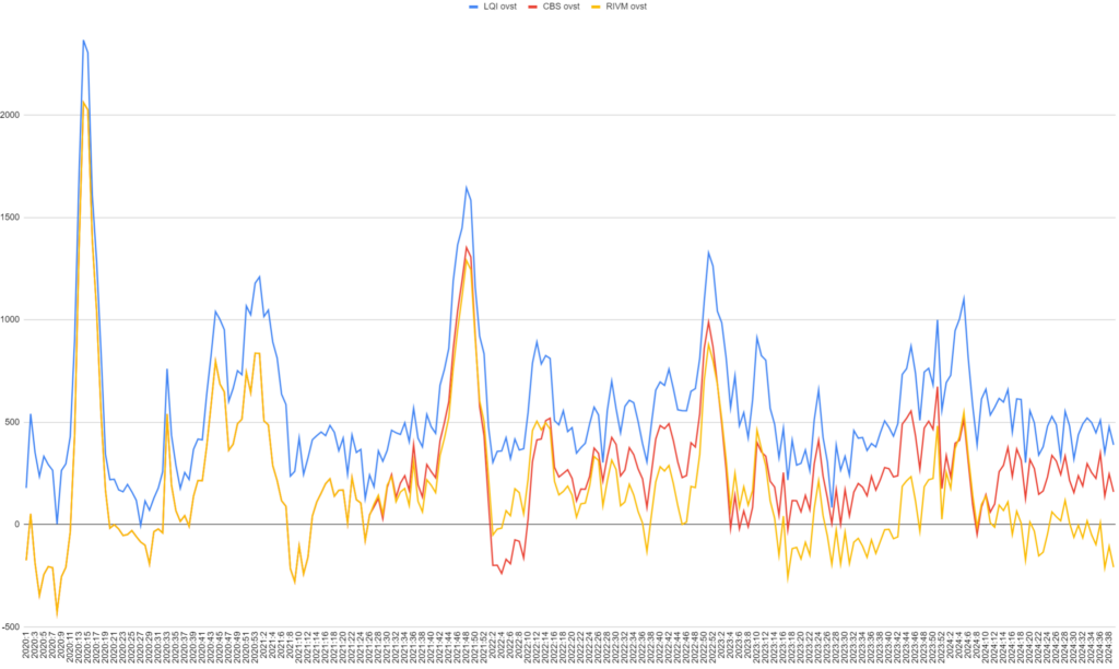 Volgens de toelichting is de oversterfte bepaald door CBS, hoe verontrustend die ook was tot begin 2024, nog een ernstige onderschatting van het probleem. Wij bepalen daarom de oversterfte t.o.v. het laagste kwartiel van 2010-2019 per week (LQI), dus expliciet prepandemie, maar wel met een correctiefactor voor bevolkingsgroei. Dit is de echte oversterfte t.g.v. SARS-CoV-2 gerelateerde en andere vermijdbare infecties. Hieronder vallen uiteraard doden door acute Covid19-infectie, maar ook doden door orgaanschade bij Long Covid of verhoogd risico op hartinfarct, beroerte en longontsteking door Covid19, uitgestelde behandelingen en operaties door overbelasting van de zorg, valpartijen door psychische aandoeningen t.g.v. SARS2, en zelfs doden door andere infectieziekten zoals influenza. Een Covid19-infectie beschadigt immers langdurig het immuunsysteem.