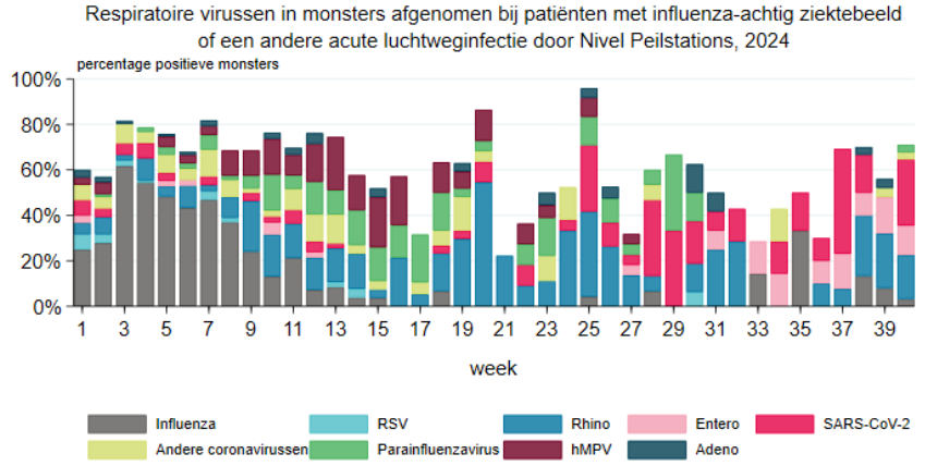 In het Nivel Surveillance Bulletin van week 40 staan voor week 1 t/m 40 de resultaten van onderzochte monsters op de Nivel peilstations in een grafiek. In week 40 waren 31 monsters onderzocht. Daarvan bleken er 9 (29%) positief op SARS-CoV-2 en 6 (19%) testten positief op het Rhinovirus. Slechts één keer werd het griepvirus gevonden.