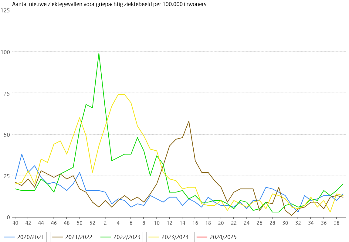 Het RIVM geeft op de pagina Feiten en cijfers griep het verloop van het aantal bij Nivel gemelde griepgevallen per week vanaf 2020 week 40 tot heden, 2024 week 40, zie grafiek hieronder. Merk op dat t.o.v. vorige weken het verloop van 2019/2020 verwijderd is, nu is het meest recente jaar dus de gele lijn, de rode lijn voor het verloop vanaf 2024 week 40 is er nog niet. De griepgolf van december t/m februari dit jaar (de rode lijn) is allang voorbij, en de wintergolf is nog niet echt op gang gekomen. Maar ach, de herfst is amper begonnen. U kunt rustig gaan slapen.