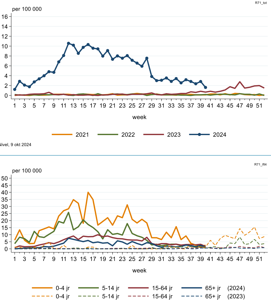 Ook is de Nederlandse kinkhoestepidemie, gestart in januari, nog steeds niet helemaal voorbij, al worden in week 40 nog “maar” 1,5 nieuwe gevallen per 100.000 per week gemeld, dat is ruim 38 nieuwe patiënten per dag over heel Nederland. Voor kinderen van 0-4 jaar is het aantal gevallen het hoogste, terwijl voor die groep kinkhoest juist erg gevaarlijk is, soms zelfs dodelijk. In 2023 begon het aantal kinkhoestgevallen in week 37 juist te stijgen. Het zou me daarom niet verbazen als we nu even in een dal zitten en volgende weken de kinkhoestgevallen weer zullen stijgen!