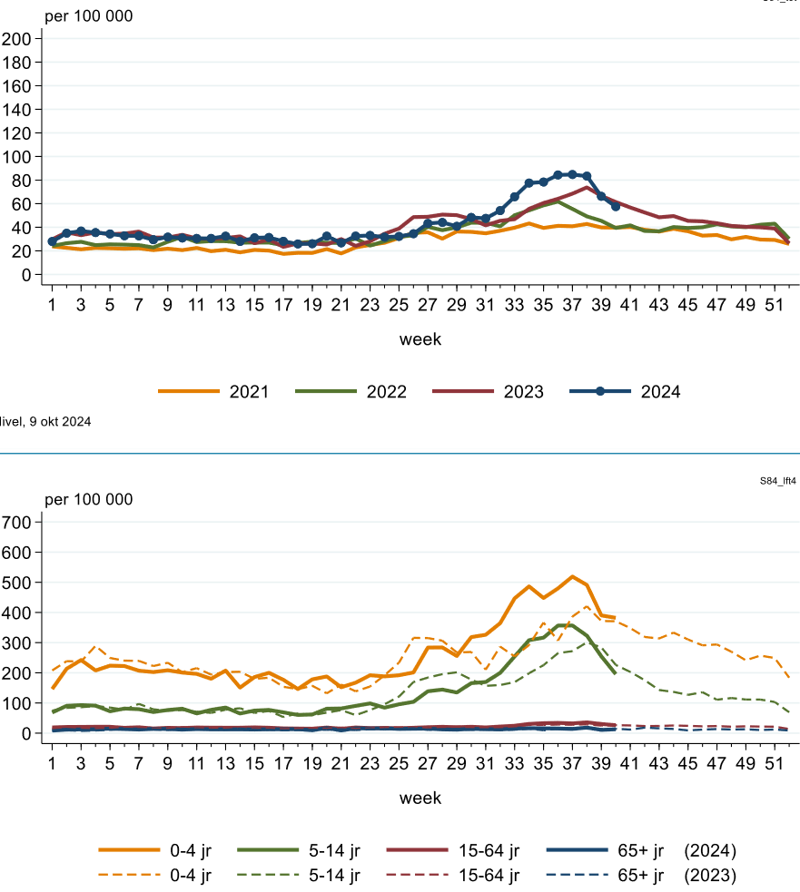 Er is inmiddels een andere infectieziekte terug van weggeweest: impetigo of krentenbaard. Dit is een bacteriële infectie die zweren veroorzaakt in en om neus en mond, met name bij kinderen. Deze ziekte bleef vóór corona beperkt tot minder dan 200 kinderen van 0-14 jaar per 100.000 per week, met een maximum begin september. Echter in het najaar van 2022 was dat aantal bijna verdubbeld, en in september 2023 piekte het aantal bij 330. In 2024 echter hebben we dat in week 37 met 400 gevallen per 100.000 overtroffen. Toch lijkt het kwartje bij de medische elite nog steeds niet te vallen. Telkens opnieuw worden alternatieve verklaringen bedacht voor deze bizarre oplevingen (de “lockdowns” van 3 jaar geleden).