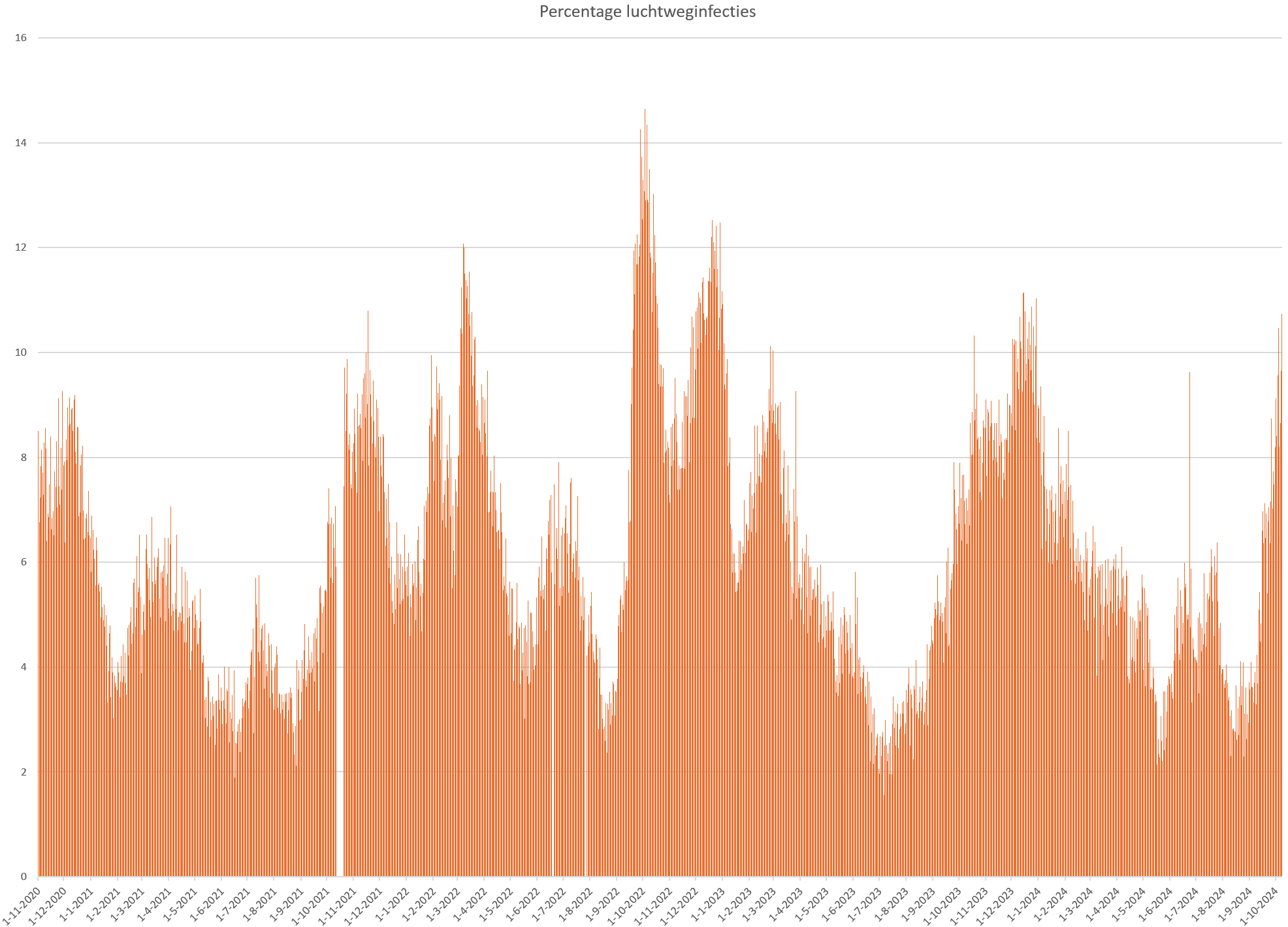 Percentage van de NL bevolking met een acute luchtweginfectie van 4-11-2020 tot 8-10-2024, o.b.v. meldingen aan RIVM