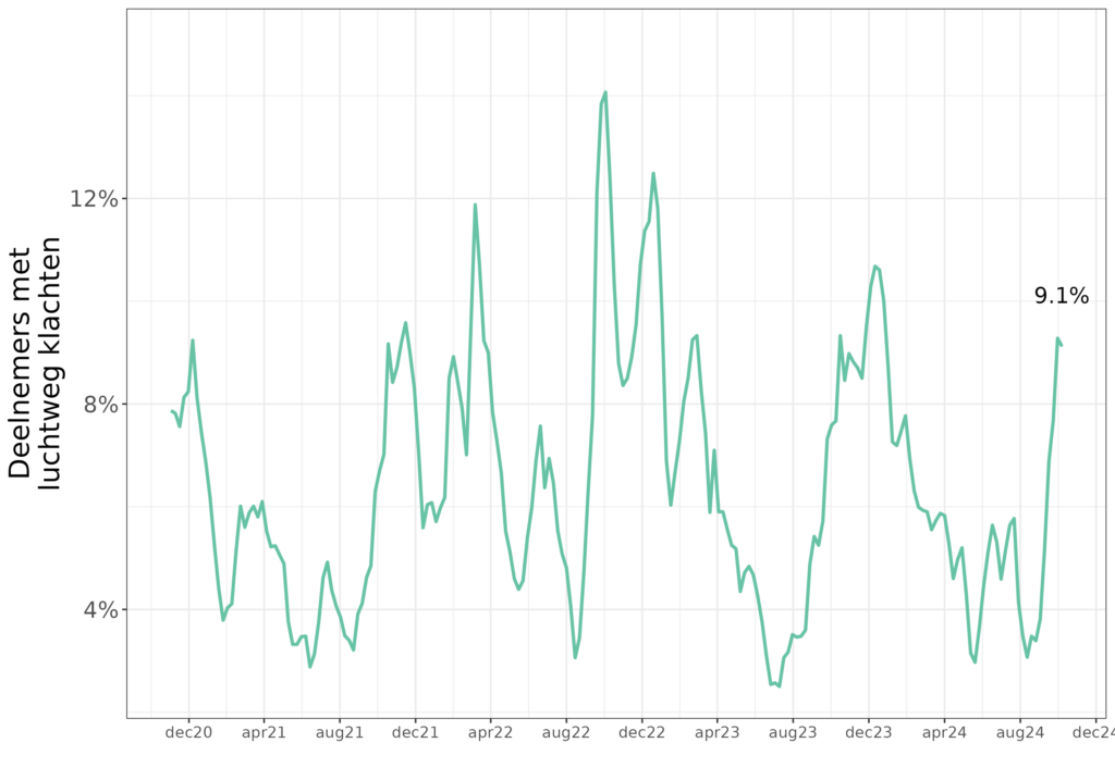 Ongeveer 9% van de deelnemers van de infectieradar meldt momenteel luchtwegklachten, zoals te zien is in de grafiek hieronder, gebaseerd op data van de infectieradar. Momenteel meldt 1,5% van de deelnemers een positieve SARS-Cov2 test, wat overeenstemt met de schatting op basis van het riool onder de aanname dat mensen 7 dagen besmettelijk blijven.