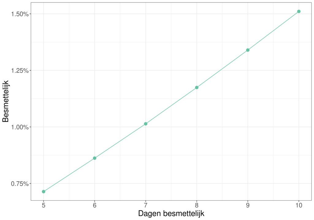 Hieruit kan ook worden geschat hoeveel mensen momenteel besmettelijk zijn, afhankelijk van de aanname hoe lang iemand besmettelijk blijft, zoals in de grafiek hieronder te zien is.