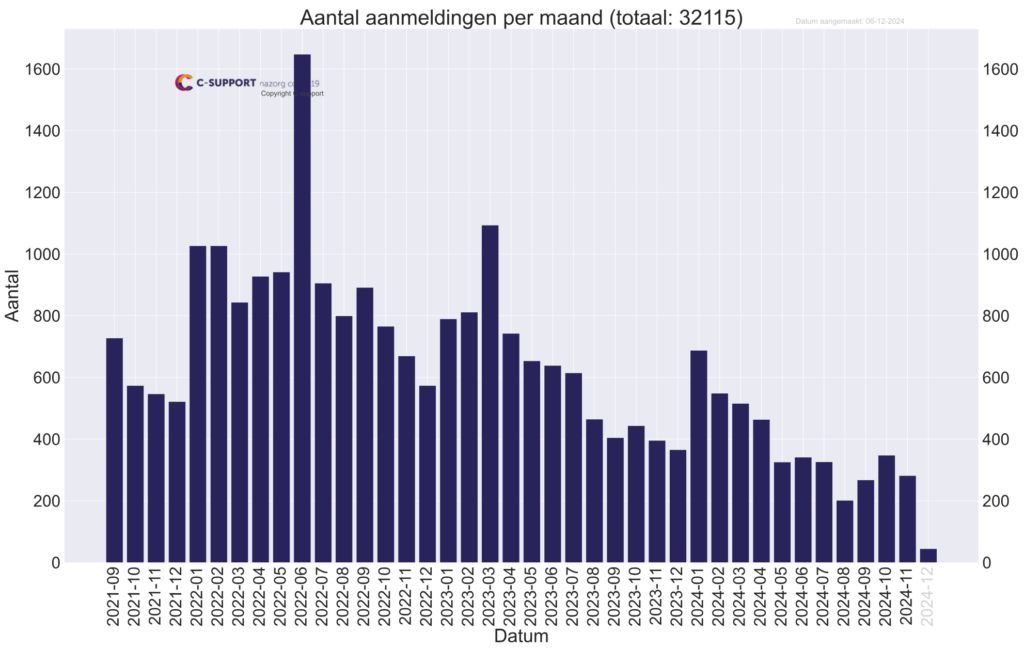 In Nederland kunnen LongCovid-patiënten zich ook aanmelden bij C-Support, maar de drempel voor acceptatie is hoog, velen kennen deze mogelijkheid niet of weten niet dat ze Long Covid hebben, en eigenlijk heeft C-Support ook niet veel te bieden aan ondersteuning. Desalniettemin hebben zich tot nu toe al 32.115 mensen aangemeld, en uit onderstaande grafiek blijkt dat de aanmeldingen sinds de openstelling in september 2021 slechts zeer langzaam dalen (in november nog een kleine 300).