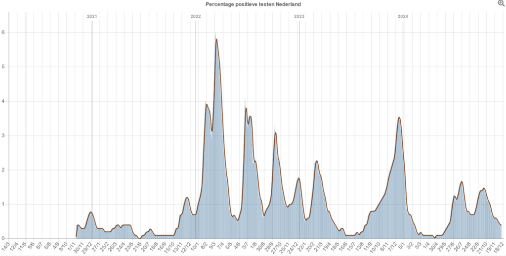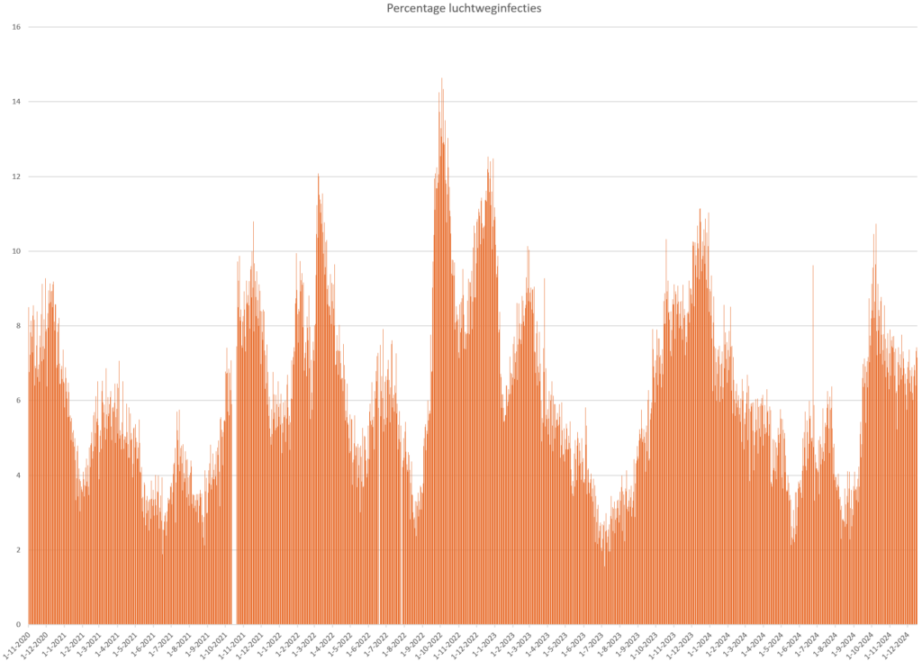 Het percentage mensen met klachten van acute luchtweginfecties, o.b.v. meldingen door een groep vrijwilligers aan het RIVM, geeft op elk moment een idee van het besmettingsrisico. Op 17 december had 7,15% van de testgroep van het RIVM last van een luchtweginfectie. Dat is best veel, en het blijft nu al wekenlang zo hoog, net als vorige jaren rond de winter. Medewerkers van het RIVM doen dit in de media vaak af met “in de winter neemt het aantal luchtweginfecties altijd toe”. Het is dus “normaal”. Maar is dat echt zo? Was dat vóór Covid19 ook zo hoog? De testgroep van het RIVM geeft daarover helaas geen uitsluitsel, die is pas in november 2021 begonnen. We weten wel dat in de winter van 2020-2021 voor het eerst sinds jaren nauwelijks griep was. Vanwege de coronamaatregelen, inderdaad. Wellicht waren er ook minder luchtweginfecties. Wie weet hoeveel klein leed we kunnen besparen door met z’n allen wat meer voorzorgsmaatregelen te nemen om de verspreiding van luchtweginfecties te verminderen. Nog afgezien van het diepe corona-leed en de jaarlijks terugkerende griepgolven.