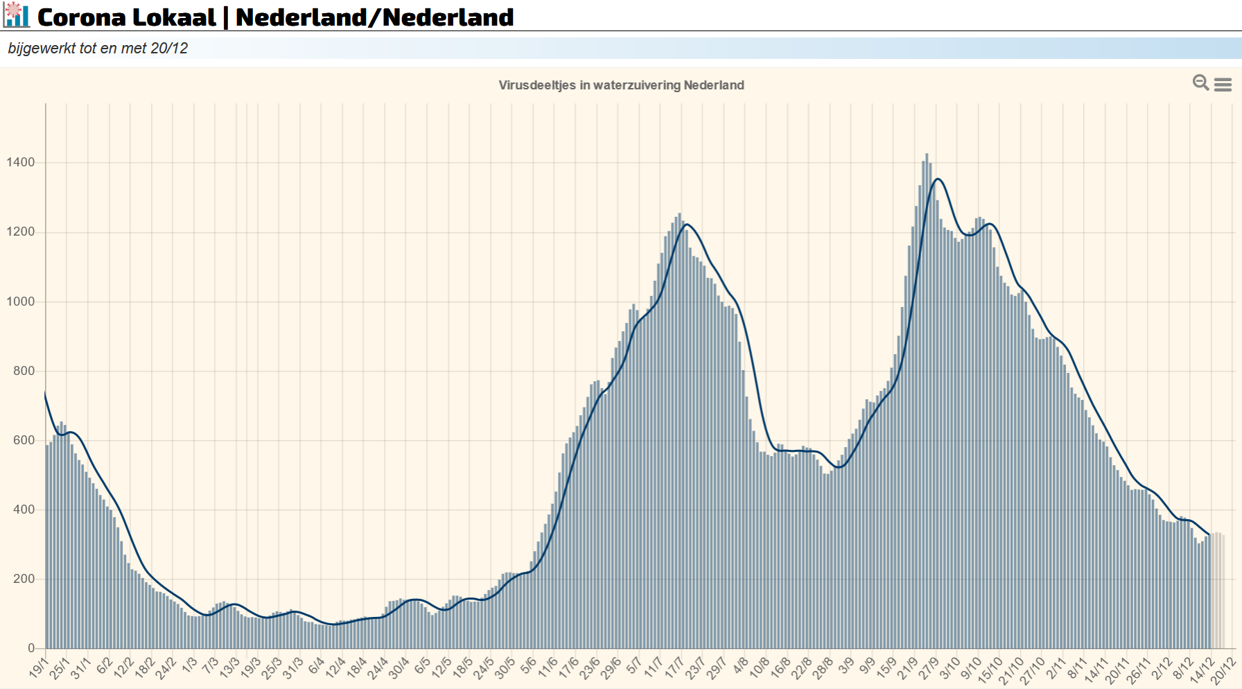 Meting 1 december: 330 (x 1011 virusdeeltjes per 100.000 inwoners) volgens Corona Lokaal. Het virusniveau is na de zomerpiek 1256 medio juli en de herfstpiek 1430 van eind september gestaag gedaald, met schommelingen. Ook de schijnbare opmaat voor een stijging van vorige week blijkt toch een tijdelijke schommeling geweest te zijn. Maar nu lijkt de onafgebroken daling sinds drie maanden echt gestopt. Het blijft de vraag of het virusniveau weer gaat stijgen vanaf nu, maar omdat er geen duidelijke kandidaat-varianten zijn die veel besmettelijker of immuunontwijkender zijn zal dat waarschijnlijk niet de komende paar weken gebeuren.