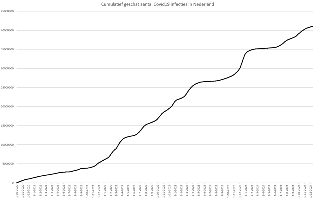 Hier is bijvoorbeeld uit af te lezen dat pas in november 2022 Nederlanders gemiddeld 1x besmet waren, maar óók dat nu al 40,9 miljoen besmettingen een feit zijn, zodat 2 jaar later Nederlanders al gemiddeld 2,27x besmet zijn geweest.