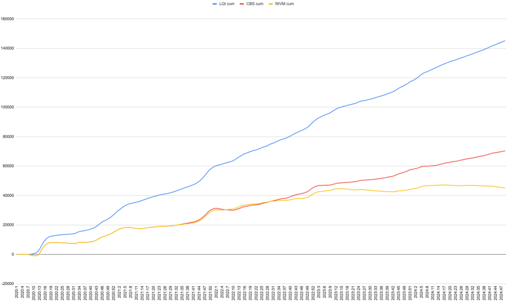 Het verloop van het cumulatieve aantal doden volgens LQI, CBS & RIVM is nu: