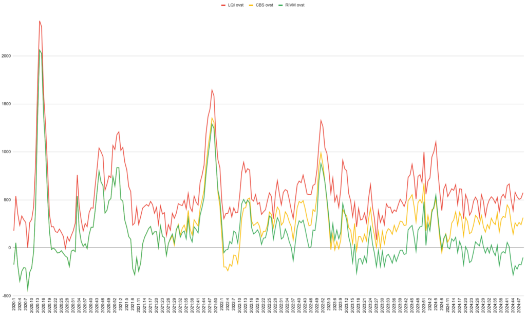 Volgens de toelichting is de oversterfte bepaald door CBS, hoe verontrustend die ook was tot eind 2023, nog een flinke onderschatting van het dodental door de pandemie. Wij bepalen daarom de oversterfte t.o.v. het laagste kwartiel (LQI) van de weeksterftes over 2010-2019, dus prepandemie, maar wel met een correctiefactor voor bevolkingsgroei. Dit is de echte oversterfte t.g.v. SARS-CoV-2 gerelateerde en andere vermijdbare infecties. Afdoende maatregelen tegen Covid19 zullen óók bijvoorbeeld vele griepslachtoffers per jaar voorkómen.