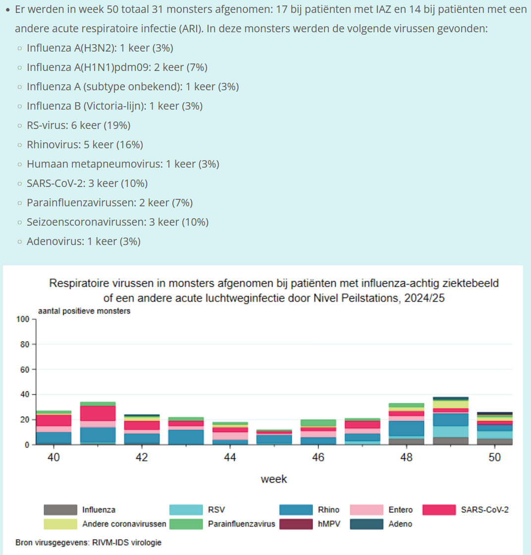In het Nivel Surveillance Bulletin van week 50 staan voor week 40 t/m 50 de resultaten van onderzochte monsters op de Nivel peilstations in een grafiek. In week 50 zijn 31 monsters onderzocht, waarvan 26 positief bleken, zie de grafiek hieronder. Deze keer werd 5x influenza gevonden, van diverse typen.