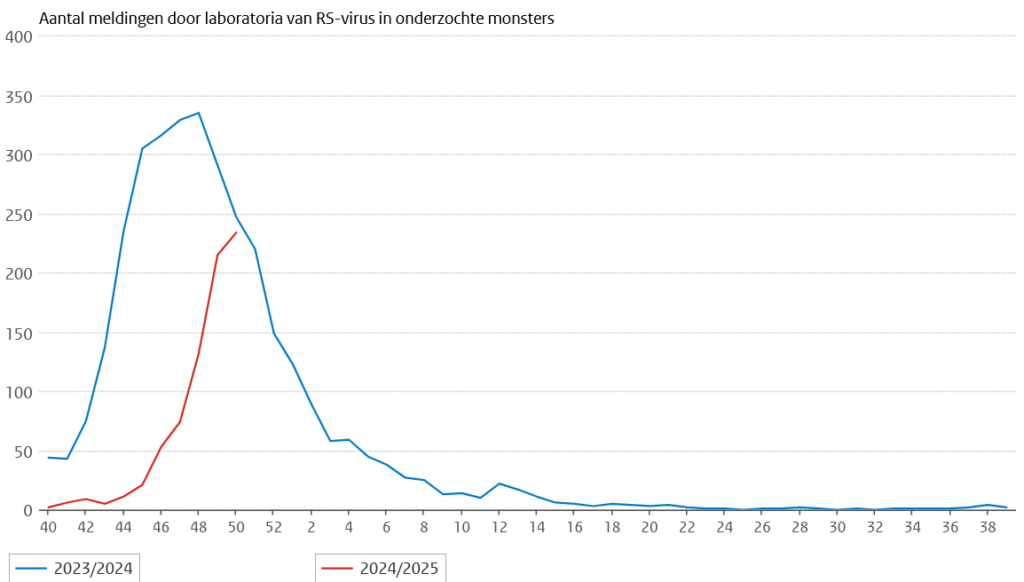 Deze keer kijken we ook naar de verspreiding van het RS-virus, dat ook tot tamelijk ernstige luchtweginfecties kan leiden, vooral bij kinderen. Het RIVM houdt het vóórkomen van deze ziekte bij op de pagina Stand van zaken RS-virus. De laatste jaren, sinds de Covid19-pandemie, heeft RS flink opgespeeld, hoewel het in absolute aantallen minder voorkomt dan influenza. Ook dit jaar is de RS-golf weer zoals vaker begonnen rond december (rode lijn in de grafiek hieronder), zij het een paar weken later dan vorig jaar.