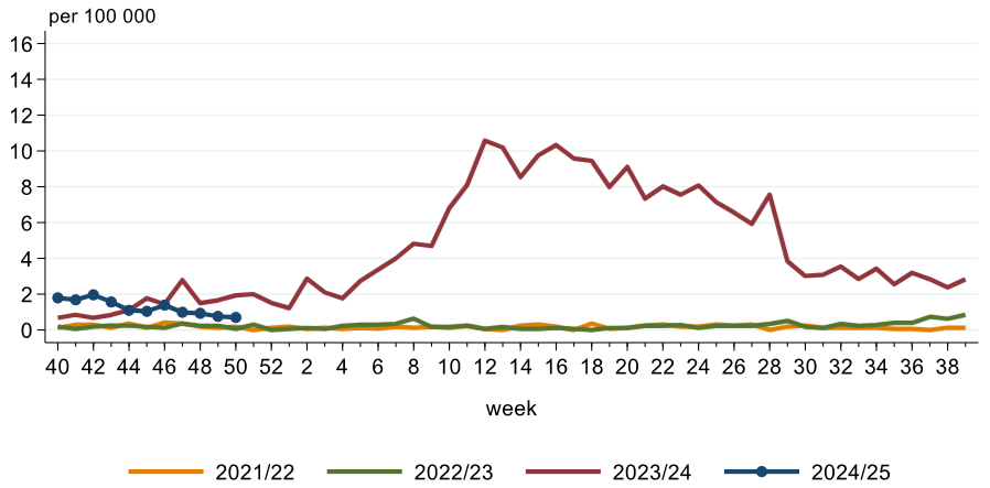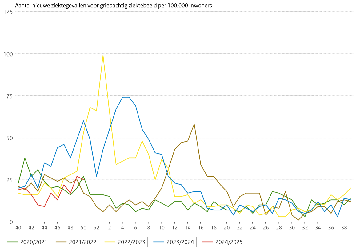 Het RIVM geeft op de pagina Feiten en cijfers griep het verloop van het aantal bij Nivel gemelde griepgevallen per week vanaf 2020 week 40 tot heden, 2024 week 50, zie grafiek hieronder. Langzaam maar zeker dient de winter-griepgolf zich aan, al blijft de ontwikkeling nog wat achter bij de twee vorige jaren.