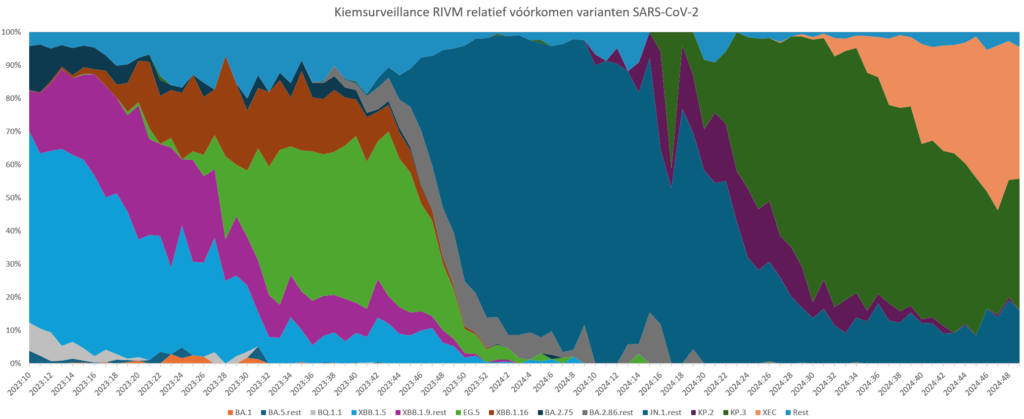 Sinds het begin van de lente is de langdurig dominante variant JN.1 door met name twee subvarianten verdrongen, KP.2 en KP.3. Vanaf juli is echter de recombinant XEC op komen zetten. Het leek er de afgelopen weken op dat deze variant dominant zou worden, maar nu blijkt dat dat niet doorzet, zie de grafiek hieronder van de relatieve voorkomens van alle varianten van maart 2023 t/m week 49 in 2024. Er zijn ook nog geen nieuwe, extra bedreigende varianten opgedoken. Dat is – voorlopig – goed nieuws.