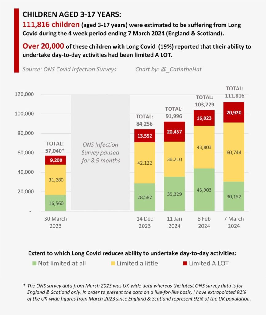 In Nederland wordt het aantal LongCovid-gevallen niet geregistreerd. In het VK wordt dit wél bijgehouden door het ONS (de Britse tegenhanger van ons RIVM). Het ONS heeft becijferd dat in maart 2024 het aantal kinderen van 3-17 jaar met Long Covid 111.816 bedroeg (ruim 1% van deze leeftijdsgroep), waarbij 20.920 kinderen hierdoor ernstig gehandicapt waren (ca. 0,2%). Volgens onderstaande grafiek overgenomen van @_CatintheHat blijven deze aantallen groeien!