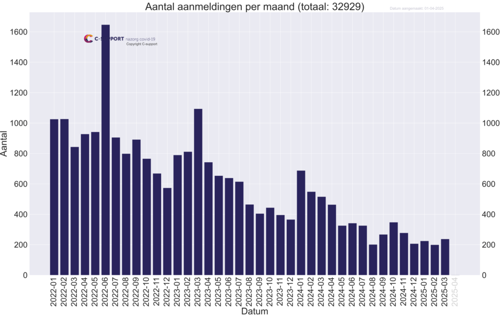 In Nederland kunnen LongCovid-patiënten zich ook aanmelden bij C-Support, maar de drempel voor acceptatie is hoog, velen kennen deze mogelijkheid niet of weten niet dat ze Long Covid hebben, en eigenlijk heeft C-Support ook niet veel te bieden aan ondersteuning. Desalniettemin hebben zich tot nu toe al 32.929 mensen aangemeld, en uit onderstaande grafiek blijkt dat de aantallen aanmeldingen per maand slechts zeer langzaam dalen. In december t/m maart waren er nog ruim 200 per maand. En dan te bedenken dat het risico op Long Covid zelden aan de orde komt in de media.