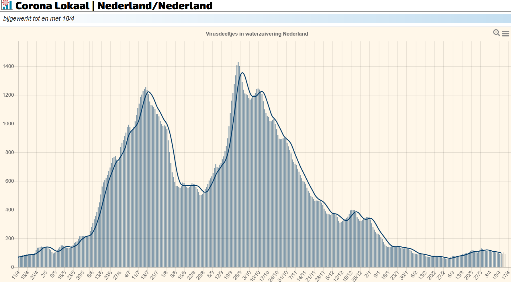 Meting 11 april: 98 (x 1011 virusdeeltjes per 100.000 inwoners) volgens Corona Lokaal, gebaseerd op rioolwatermetingen van het RIVM.