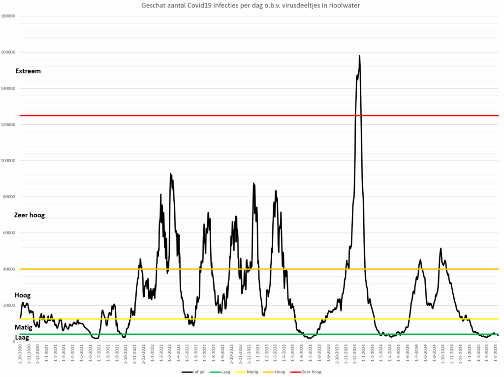 Besmettingsrisico Covid19 is nog steeds LAAG, maar stijgt sinds carnaval heel langzaam. Rioolwaarde op 11-4 was 98. Geschat aantal besmettingen PER DAG ~3500 → ~350 extra LongCovid-patiënten per dag, waarvan ~85 ernstig beperkt. De griepgolf, hoogste in 5 jaar, sterft langzaam weg. Volgens RIVM is het aantal (extra) griepdoden sinds 1 januari minstens 3730. Zo’n 3,89% heeft een luchtweginfectie, dit blijft langzaam dalen.