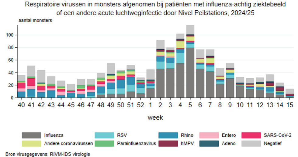In het Nivel Surveillance Bulletin van week 15 in 2025 staan voor week 2024-40 t/m 2025-15 de resultaten van onderzochte monsters op de Nivel peilstations in een grafiek. In week 15 blijken slechts 14 monsters onderzocht, waarvan er 6 positief bleken, zie de grafiek hieronder. Dit is zo beperkt dat het weinig zegt over rondgaande infecties. Het humaan metapneumovirus, dat veel voorkomt in China maar de afgelopen weken relatief vaak werd aangetroffen door Nivel, lijkt ook weer op zijn retour.