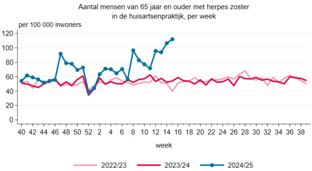 De afgelopen weken wordt in het Nivel bulletin ook een duidelijke verhoging van het aantal gevallen van gordelroos (Herpes Zoster) gemeld sinds eind november 2024, zie onder. Het is bekend dat het herpesvirus, dat latent aanwezig is in veel patiënten, na een covidbesmetting weer kan opleven. Er is wel een goed vaccin tegen herpes zoster, maar bijna niemand krijgt het.