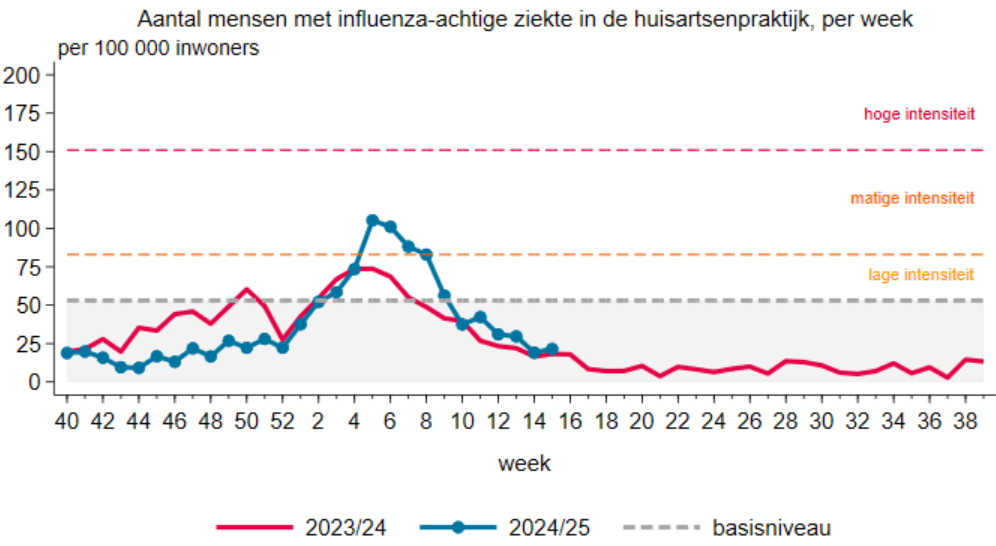 Ook deze week waren er nog iets meer griepgevallen dan het “normale” basisniveau, zie de grafiek hieronder. Officieel is de griepgolf voorbij, maar sinds begin dit jaar zijn wel tenminste 3730 mensen bezweken aan de griep.