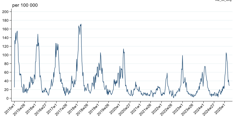 Deze keer kijken we ook weer naar de verspreiding van het RS-virus, dat ook tot tamelijk ernstige luchtweginfecties kan leiden, vooral bij kinderen. Het RIVM houdt het vóórkomen van deze ziekte bij op de pagina Stand van zaken RS-virus. De laatste jaren, sinds de Covid19-pandemie, heeft RS flink opgespeeld, hoewel het in absolute aantallen minder voorkomt dan influenza. Ook dit jaar is de RS-golf weer zoals vaker begonnen rond december (rode lijn in de grafiek hieronder). Hoewel het aantal meldingen alweer flink gedaald is, was de golf dit jaar hoger én breder dan vorig jaar.