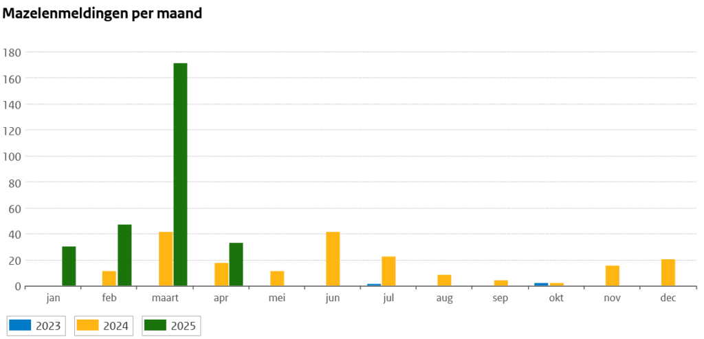 Ook mazelen is weer terug, zoals gemeld op nu.nl. In onderstaand overzicht van het RIVM zien we dat het aantal gemelde gevallen in de eerste maanden van dit jaar beduidend hoger was dan vorige jaren. In maart waren er zelfs 170 meldingen, ruim 4x zoveel als vorig jaar, en t/m 16 april zijn in die maand al bijna 2x zoveel mazelenmeldingen geweest als in april 2024. De geruststelling van het RIVM dat de meeste gevallen meegebracht worden uit het buitenland worden wel een beetje sleets. Zeker als in Rotterdam een basisschool een week moest sluiten omdat er 32 gevallen van mazelen gemeld werden! Mazelen is de meest besmettelijke virusziekte die we kennen, en met de huidige lage vaccinatiegraad (schoolkinderen cohort 2006 zo’n 90,9%) is het wachten op een echt forse uitbraak. En ja, door herhaalde Covid-besmettingen is de weerstand tegen ziekteverwekkers flink verzwakt.