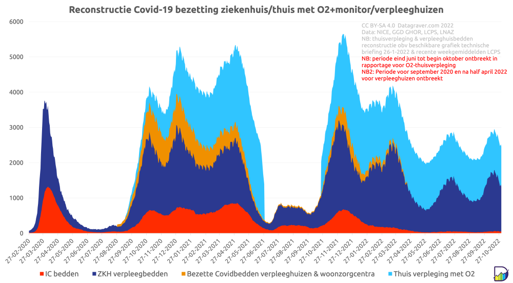 Sinds maart 2020 worden door NICE, GGD GHOR en het Landelijk Coördinatiecentrum Patiënten Spreiding (LCPS) cijfers gepubliceerd over het aantal Covid-patiënten in de ziekenhuizen en op de IC’s, en daarnaast ook het aantal opnames per dag. Dat lijkt een goede indicatie voor het aantal ernstige Covid-patiënten in Nederland, maar zieken in verpleeghuizen zijn hierin niet zichtbaar. Bovendien worden sinds september 2020 zieke patiënten steeds vaker naar huis gestuurd met zuurstof, als er voldoende mantelzorg is. In onderstaande grafiek van de website van Datagraver (nu helaas gediscontinueerd) is het gereconstrueerde verloop van alle categorieën ernstig zieken weergegeven, in IC, ziekenhuis, verpleeghuis én in thuisverpleging, van 27 februari 2020 tot 27 oktober 2022 (dit was de laatste update).
