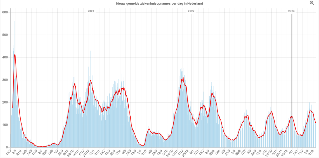 Hier vallen op: relatief weinig besmettingen tot najaar 2021 (~300), dan een lage piek (delta, ~1200), hoge pieken in februari en maart 2022 (omicron BA.1/2, ~2500), een tamelijk hoog dal in mei 2022 (~250), een hoge piek in de zomer (omicron BA.4/5, ~1900), een hoog dal in september (~500), een hoge piek in oktober (omicron BQ1.1, ~1700), een extreem hoog dal in november (~900), de eindejaarspiek ~2350, de op één na hoogste tot nu toe. Dan recent de carnavalspiek met een top van ~2300, waarschijnlijk te wijten aan de immuniteit ontwijkende XBB.1.5 variant. Na 5 maart leek deze golf weer voorbij en dat werd ook fijntjes gemeld door het RIVM, maar op 15 maart stokte de daling op ~1700, kwam er weer een kleine opleving en nu lijkt de golf dan echt op zijn retour.