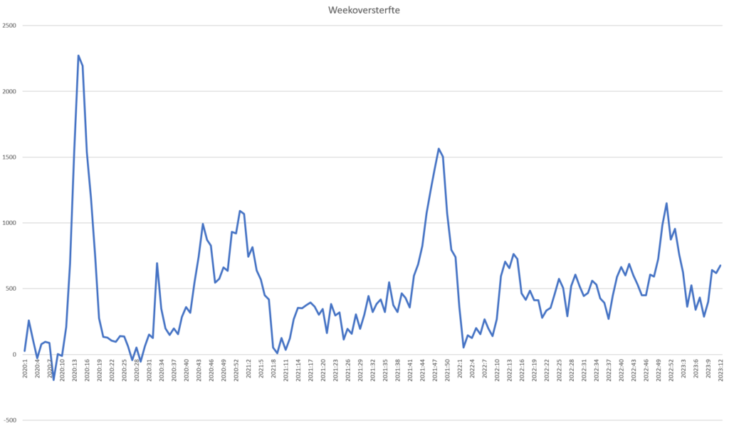 Merk verder op dat de gemiddelde weeksterftes van 2023 week 1 t/m 11 naar boven bijgesteld zijn in de rapportage van het CBS: nagekomen meldingen tot zelfs 10 weken terug. Week 12 is sowieso een voorlopige schatting. Het CBS heeft aangegeven dat “nu corona voorbij is” die laatste week niet meer gepubliceerd wordt vanaf april. Dan wordt dus óók de oversterfte dus weer een stukje minder actueel.
