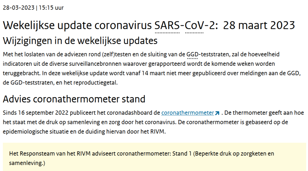 In onderstaande wekelijkse update over de coronasituatie wordt ook aangekondigd dat de rapportage nog verder uitgekleed wordt. En o ja, ondanks de huizenhoge carnavalsgolf van besmettingen houdt het RIVM vast aan de status: “Het coronabeeld is al tijden rustig”, dus de corona-“thermometer” staat nog steeds op groen: