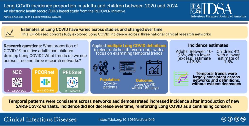 In februari van dit jaar is een meta-analyse gepubliceerd naar de prevalentie van Long Covid in verschillende nationale netwerken van de gezondheidszorg in de VS. Dat leverde grafieken op als de onderstaande, waarbij het aantal geregistreerde LongCovid-patiënten tot ver in 2023 is blijven stijgen, en 10-30% van de bevolking LongCovid-gerelateerde klachten had.