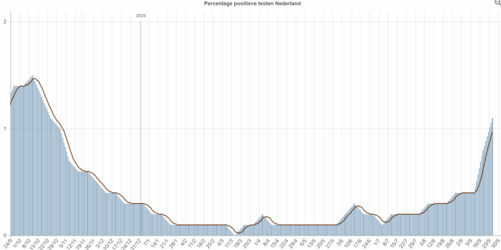 Op basis van rioolwatermetingen is het besmettingsrisico Covid19 nog steeds HOOG, maar het loopt de laatste weken wat terug. Het percentage met Covid19 besmette personen in de RIVM testgroep stijgt echter pijlsnel, van 0,4% op 11-9 naar 1,1% op 25-9. Het is niet uit te sluiten dat het aantal besmettingen in de huidige golf nog (veel) verder gaat stijgen.
