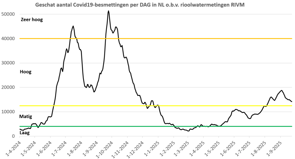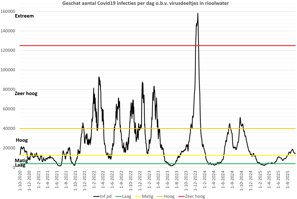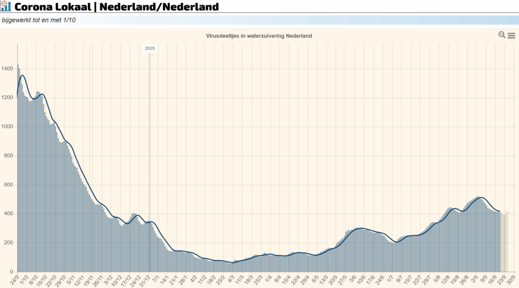 N.B. Het aantal rioolwaterzuiveringen waar corona-virusdeeltjes worden gemeten is vanaf 7 juli 2025 door RIVM teruggebracht van 311 naar 133, en de meetfrequentie werd 1x per week. Hierdoor liggen de meest recente betrouwbare meetgegevens tegenwoordig ca. 2 weken in het verleden. Wij gebruiken alleen metingen met gegevens van RWZI verzorgingsgebieden met in totaal tenminste 10 miljoen inwoners.