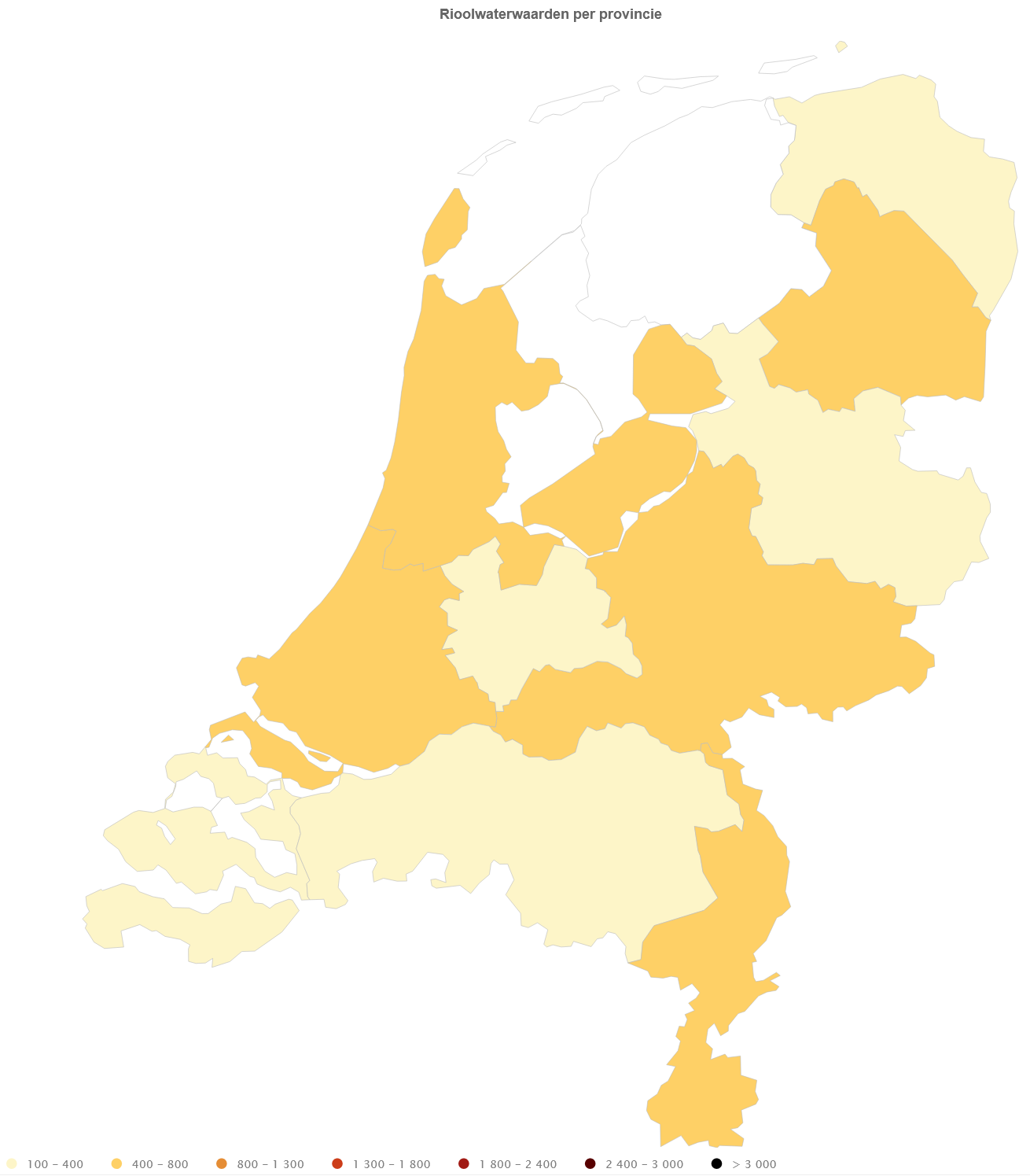 Op Corona Lokaal is ook de landelijke spreiding van het coronavirus te zien, over de provincies en over de afvalwaterstations. Heel Nederland, behalve Friesland, is nu ten minste lichtgeel gekleurd (rioolwaarde tussen 100 en 400), terwijl 6 provincies donkergeel gekleurd zijn (400-800). Die verdeling moet echter met een flinke korrel zout genomen worden, want de meest recente betrouwbare metingen van Friesland, Groningen, Overijssel en Limburg zijn van 2 september. Om dezelfde reden zijn de virusniveaus van individuele waterzuiveringsstations weggelaten, veel stations hebben al maandenlang geen meting meer uitgevoerd, en zullen waarschijnlijk nooit meer rapporteren.