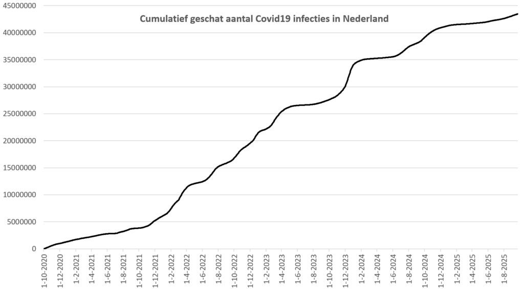 Op 23 september was het geschatte aantal besmettingen per dag ruim 14.000. In de voorafgaande week zouden in totaal 102.000 mensen besmet zijn, waarvan ruim 10.000 naar verwachting langer dan 3 maanden klachten zullen houden, Long Covid dus. Zo’n 2500 daarvan zullen ernstig beperkt worden in hun dagelijks leven en werk.