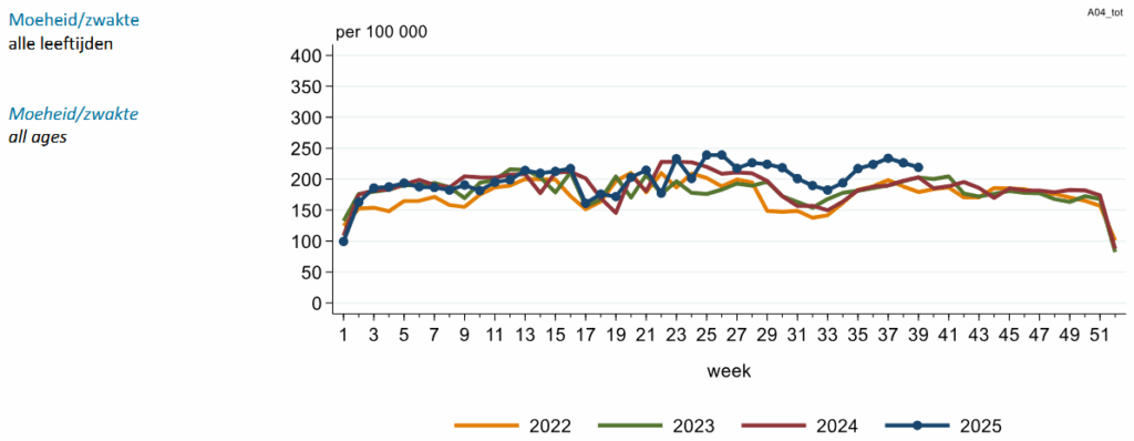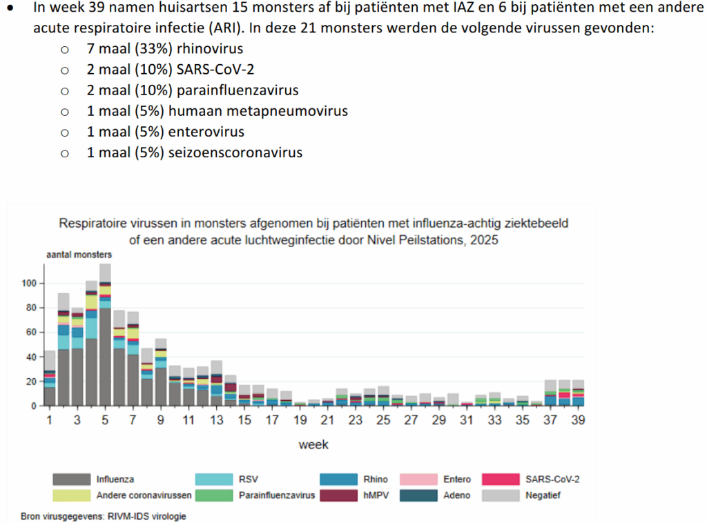 In het Nivel Surveillance Bulletin van week 39 in 2025 wordt de status van veel infectieziektes in Nederland belicht. Het aantal afgenomen monsters van respiratoire infecties was in week 39 weer wat hoger dan afgelopen zomer: laag: 21 monsters waarvan 14 positief. In de helft van het aantal positieve monsters werd het Rhinovirus aangetroffen (de “normale neusverkoudheid”), SARS-CoV-2 werd 2 keer aangetroffen en Parainfluenzavirus ook 2 keer. Er werd geen Influenzavirus gevonden.