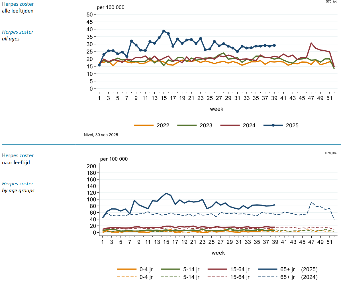 Het sinds het begin van dit jaar sterk verhoogde vóórkomen van gordelroos (Herpes Zoster) blijkt bijzonder hardnekkig, vooral in de categorie 65+ is het flink verhoogd dit jaar, 30-90% meer dan normaal. Het is bekend dat het herpesvirus, dat latent aanwezig is in veel patiënten, na een covidbesmetting weer kan opleven, en zelfs in de daarop volgende periode tot een verhoogd risico op cardiovasculaire klachten kan leiden, volgens een recente publicatie in Nature. Er is wel een goed vaccin tegen herpes zoster, maar bijna niemand krijgt het. Patiënten moeten er zelf voor betalen.