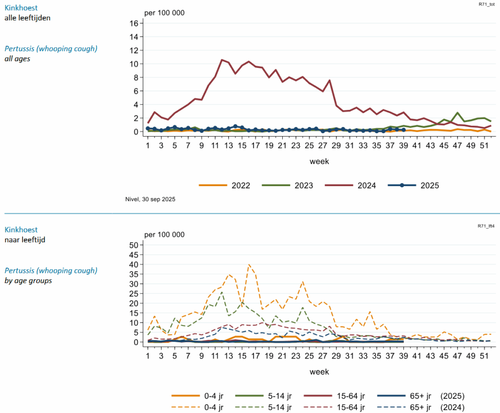 Na de heftige uitbraak van kinkhoest in 2024, ook al zo’n vergeten infectieziekte die sinds de coronapandemie weer helemaal terug is, hebben we de verspreiding van deze akelige “honderd dagen hoest” een tijdje gevolgd in deze weekberichten. De ziekte leek weer bedwongen. Maar sinds week 37 is weer een lichte verhoging zichtbaar, dus we blijven dit kritisch volgen. Kinkhoest is vooral voor jonge kinderen levensgevaarlijk en door de antivax verhalen worden helaas minder baby’s gevaccineerd.