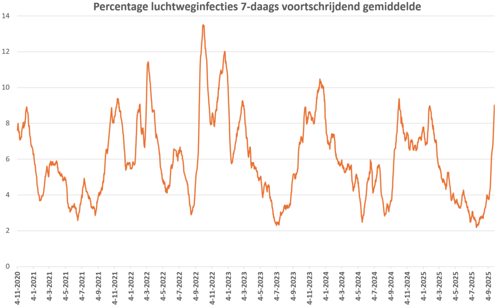 Volgens RIVM infectieradar stijgt ook het aantal luchtweginfecties als geheel razendsnel de laatste maand, op 6 september stond de teller op 3,74%, op 27 september had al 9,01% luchtwegklachten. Naar verwachting stijgt dit nog verder. De winterperiode, sinds het begin van de pandemie traditioneel met veel luchtweginfecties over 10%, heeft een vliegende start gekregen.